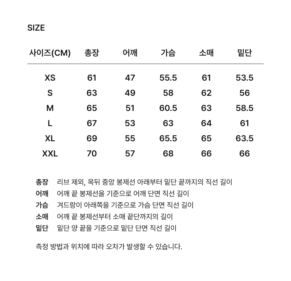 XS: 總長: 61cm / 胸圍: 111cm (43.7吋) / 肩寬: 47cm (18.5吋)