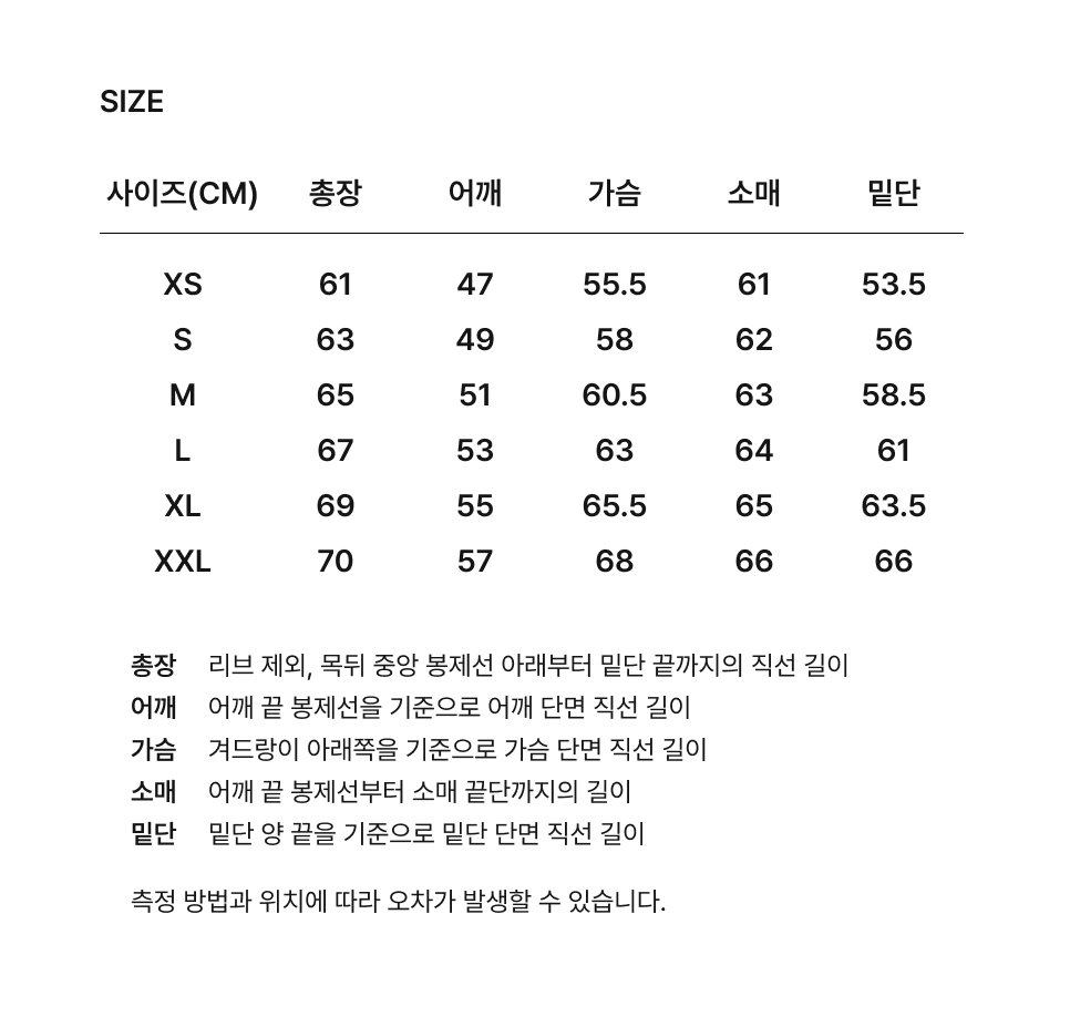 XS: 總長: 61cm / 胸圍: 111cm (43.7吋) / 肩寬: 47cm (18.5吋)